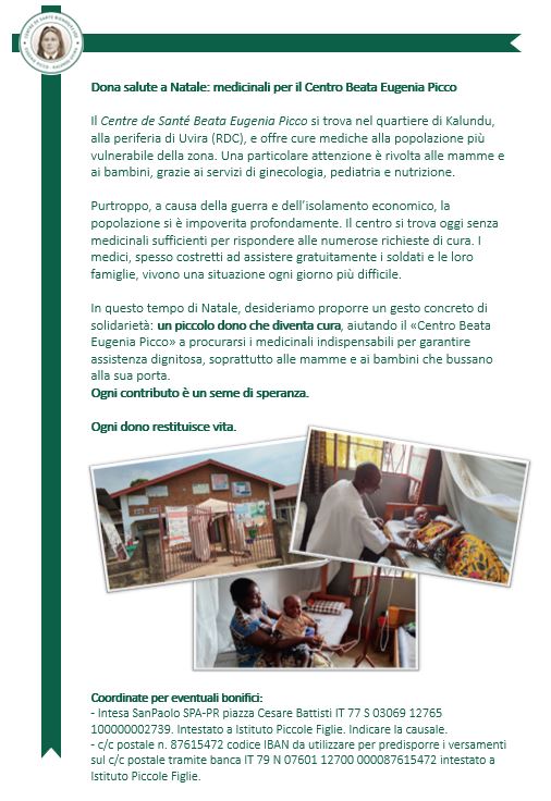 In questo tempo di Natale, desideriamo proporre un gesto concreto di solidarietà: un piccolo dono che diventa cura, aiutando il «Centro Beata Eugenia Picco» a procurarsi i medicinali indispensabili per garantire assistenza dignitosa, soprattutto alle mamme e ai bambini che bussano alla sua porta.