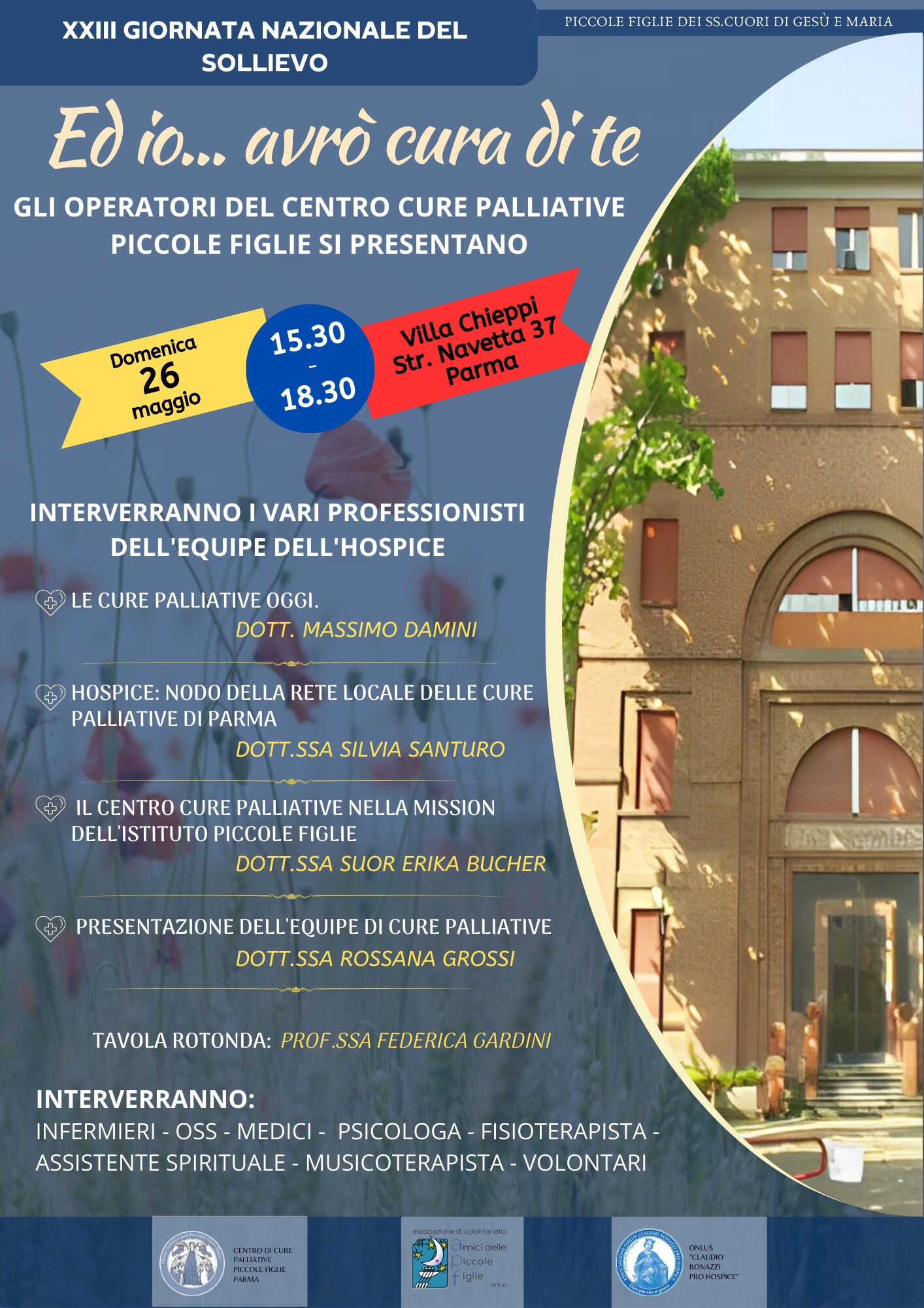 Domenica 26 maggio presso Villa Chieppi, in strada Navetta 37 Parma in occasione della 23° giornata nazionale del sollievo i terrà un convegno dal titolo: “Ed io… avrò cura di te” Gli operatori del Centro Centro Cure Palliative si presentano, per fare conoscere più da vicino coloro che operano nell’Hospice e il valore delle cure palliative che, come dice anche Papa Francesco “ garantiscono al paziente non solo un’assistenza medica, ma anche un accompagnamento umano e vicino”.